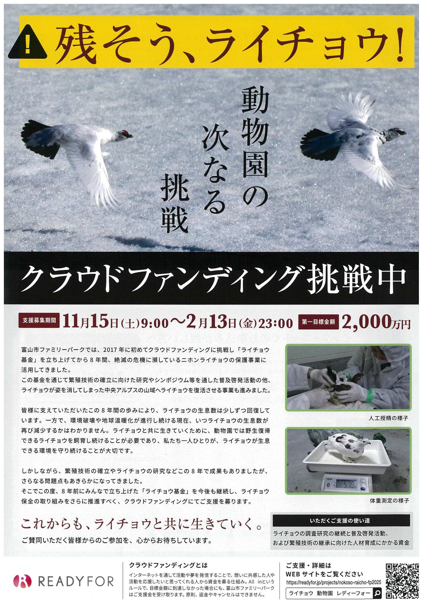 「ライチョウの調査研究の継続と普及啓発活動、および繁殖技術の継承に向けた人材育成にかかる資金」を